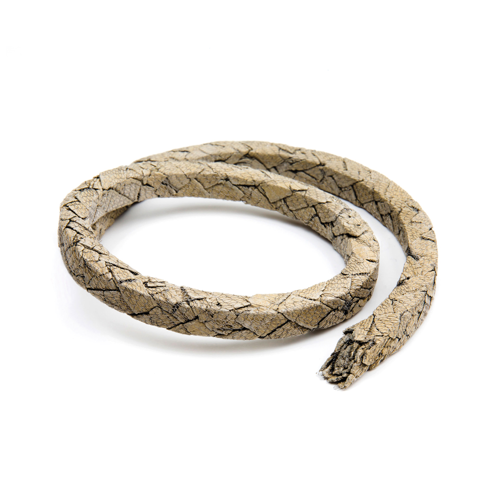 Hecho al sobretrenzar tiras de lámina de Thermiculite con un fino alambre de Inconel 600 (0.09 mm de diámetro) y luego entrelazando varias de esas tiras de Thermiculite/Inconel para producir un material de sellado de sección cuadrada disponible en forma de bobina continua.